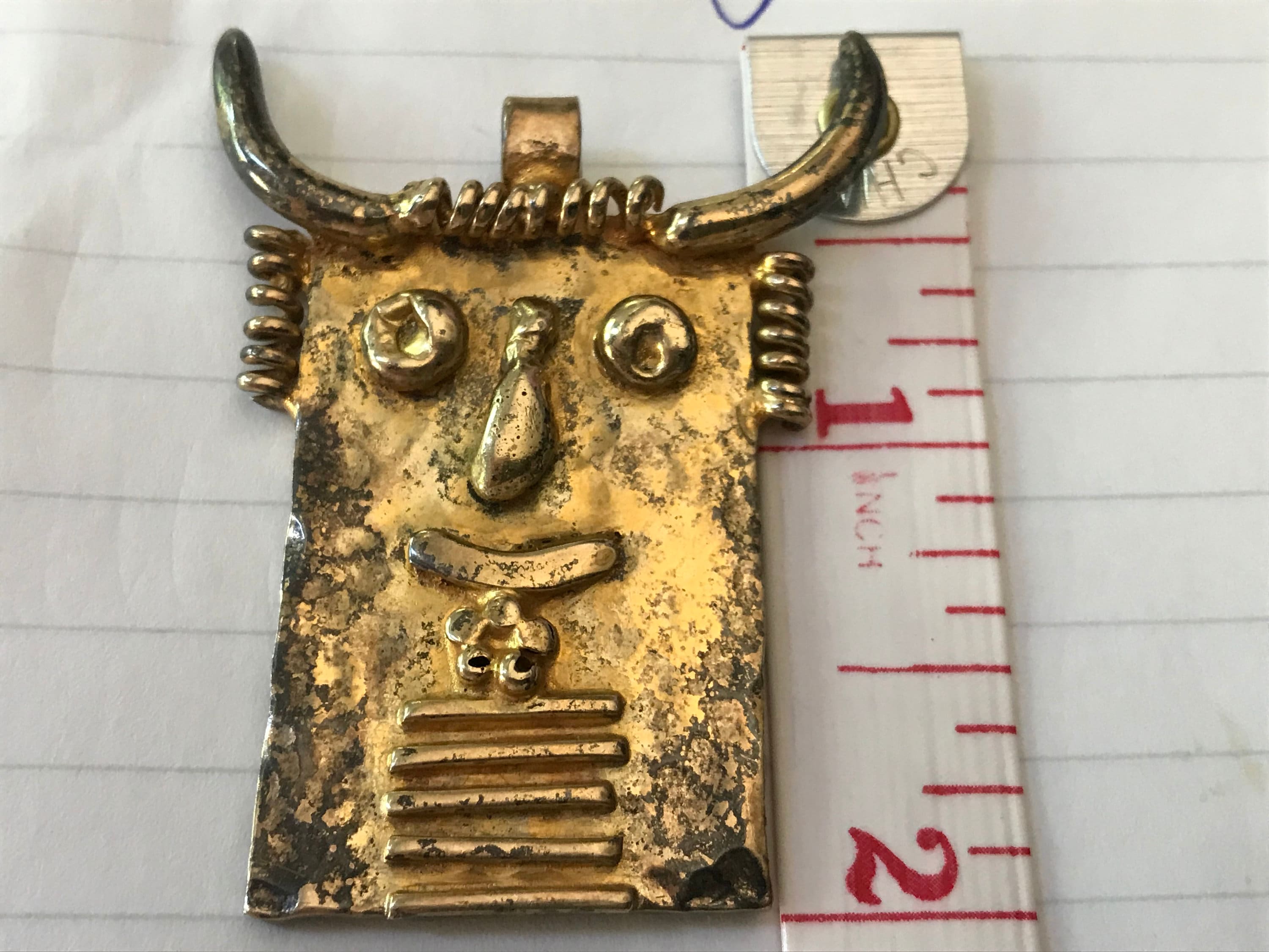RARE RARE Delillo Wm de lillo William Delillo Haute Couture Sterling 925 Vermeil Gold Wash Tribal Aztec Mayan Warrior Pendant Signed